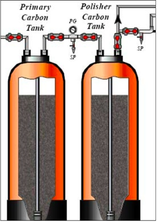 Karbon filtreler ayrıca adsorpsiyon yoluyla organik maddeleri, koku üreten malzemeleri, pestisitleri ve endüstriyel solventleri de uzaklaştırır. Adsorpsiyon, sıvıların, gazların veya asılı malzemelerin bir yüzeye yapışması işlemidir. Giriş suyunun kalitesine göre sistemde bir veya iki karbon tankı olabilir. İki tankın seri olarak kurulması durumunda, ilk tank çalışan, ikinci tank yedek olarak adlandırılır. İki tankın seri olarak kullanılması, besleme suyundaki klorun çok etkili bir şekilde giderilmesini sağlar ve karbon tanklarından birindeki arıza durumlarının arıtılmasını garanti eder.