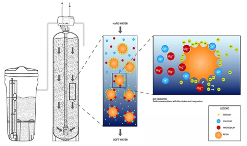 Su yumuşatma, iyon değişimi adı verilen bir mekanizma ile sudaki sertliği giderir. Yumuşatma tanklarının içinde kullanılan reçine, iyonları daha fazla değiştiremez hale geldiği doyma noktasına kadar iyonları değiştirebilir. Bu noktada, reçinenin yüzeyini serbest bırakmak, yeniden aktive etmek ve sertlik gidermeye hazırlanmak için esas olarak sodyum klorür (NaCl) olmak üzere tuz (tuzlu su) ile rejenerasyon gereklidir.